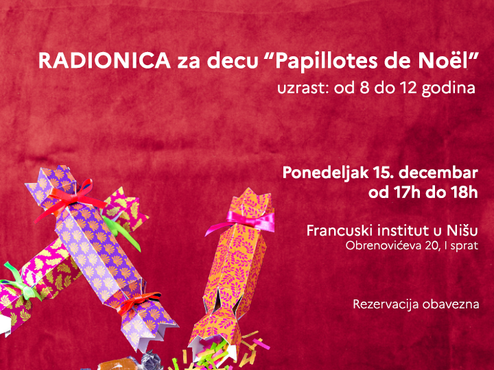 U duhu božićnih praznika, Francuski institut u Nišu vas poziva na radionicu posvećenu izradi francuskih božićnih slatkiša "Les Papillotes de Noël". Saznaćete priču o nastanku ove tradicije u Francuskoj i pokazaćete svoju kreativnost ukrašavanjem poklončića.